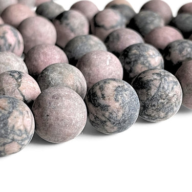 Disse smukke matte rhodonitperler har et naturligt farvespil af rosa, gammelrosa, brun, beige, grå og sort. Den bløde, matte overflade giver perlerne et roligt og elegant udtryk, perfekt til både klassiske og rustikke smykkedesigns.