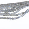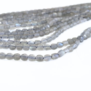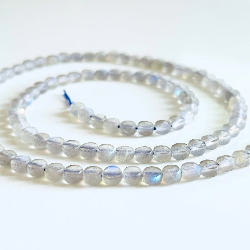 Labradorit er en mystisk og fascinerende ædelsten, kendt for sin smukke iriserende effekt, også kaldet labradorescens, hvor lyset reflekteres i blå, grønne og gyldne skær. Disse 4 mm flade perler har en elegant grå basefarve med naturlige glimt af farvespil, der gør dem unikke og levende i ethvert smykkedesign.