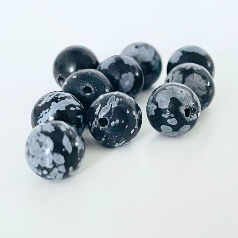 Obsidian snefnug er en vulkansk sten med et naturligt mønster af lyse "snefnug", som dannes af små krystaller i den ellers dybsorte sten. Hver perle er unik, og det karakteristiske kontrastmønster gør den nem at bruge i designs, hvor der ønskes lidt spil uden for mange farver. Den glatte overflade gør perlerne behagelige at bære og nemme at tråde på både elastik, wire og smykketråd.