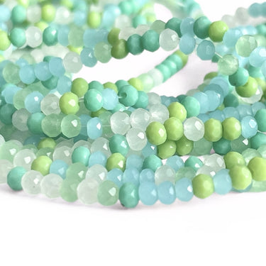 Her får du små, facetslebne glasperler i en blanding af grønne, turkise og hvide nuancer. Farverne er mættede og uigennemsigtige, og facetterne giver dem et diskret spil i lyset. Mixet er sammensat, så det færdige smykke får et friskt og levende udtryk – uden det bliver for rodet.