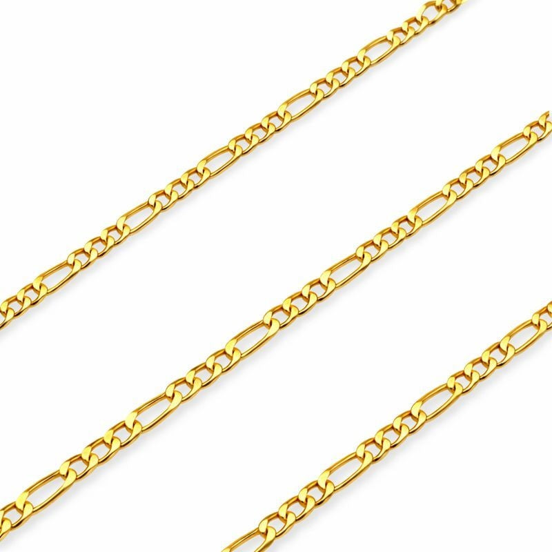 En klassisk Figaro-kæde i forgyldt sølv, der er nem at bruge til både armbånd og halskæder. De tre små og ét stort led gentager sig hele vejen og giver et roligt udtryk med lidt spil i. Kæden er bøjeligt uden at virke slap, og overfladen er blank uden at være spejlglat. De aflange led er åbne nok til at kunne formes en smule med en rundtang – en praktisk detalje når du skal montere lås eller lave en fin afslutning. Brug den alene eller sammen med perler, wire eller wirebeskyttere – den passer ind i det meste og er nem at arbejde med.