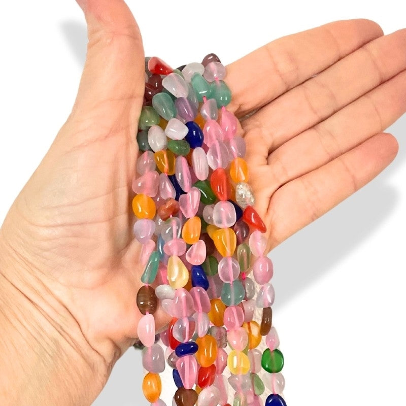 Disse smukke Cat’s Eye glasperler har en skinnende effekt og en blød nugget-form, der giver et organisk og naturligt look til smykker. Perlerne changerer i lyset, hvilket skaber et smukt farvespil i dine designs. De blandede farver gør dem ideelle til legende og kreative smykker, enten alene eller kombineret med metalperler og andre sten.