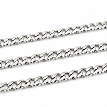 Med en bredde på ca. 5 mm er kæden tydelig uden at virke tung. Den passer godt til både enkle smykker og designs med lidt mere fylde. Den blanke ståloverflade fungerer flot sammen med både mørke og lyse materialer.