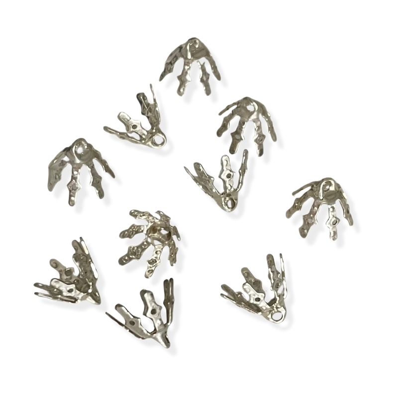 De her sølvfarvede bead caps – også kaldet perleskåle – har et lille øje på ca. 1,5 mm, som gør dem nemme at bruge sammen med tråd, øsken eller wire. Metallet er blødt og kan let formes, så skålen tilpasses perlens størrelse. De samler smykkets afslutning på en pæn måde og giver et rent udtryk uden at tage fokus fra perlerne. Velegnet til både armbånd, halskæder og øreringe, hvor du vil have en lille, diskret detalje, der får hele smykket til at se færdigt ud. En praktisk lille del, som hurtigt bliver fast inventar på smykkebordet.
