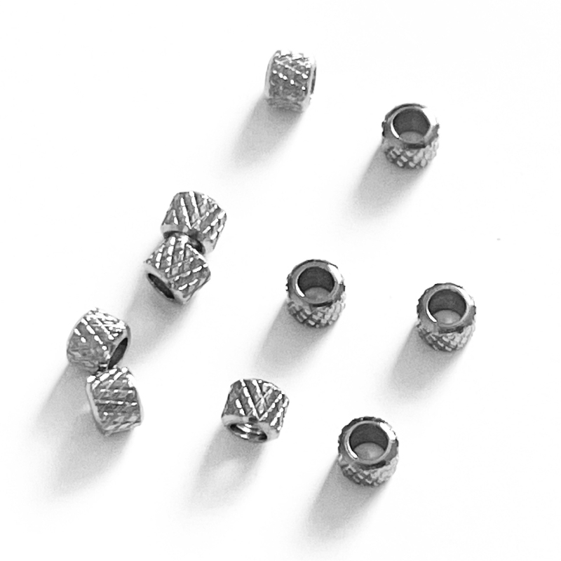 De små stålperler her er gode, når du vil tilføje lidt struktur uden at tage for meget plads. Overfladen har et rillet mønster, som giver et råt og lidt teknisk udtryk. De er lavet i rustfrit stål og er nikkelfri, så de kan bruges direkte mod huden uden problemer.