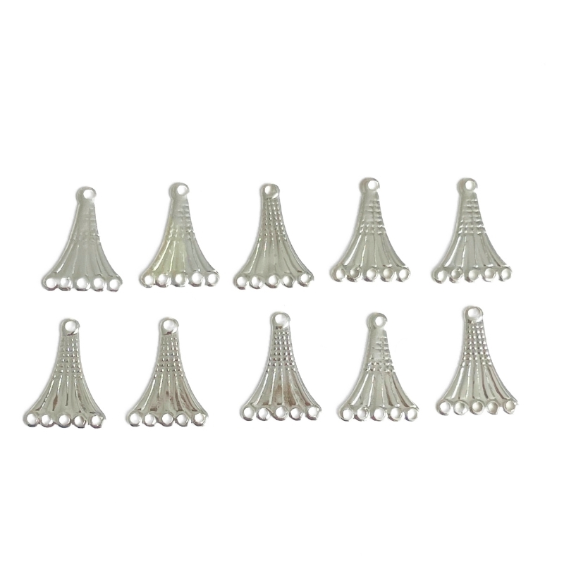 Disse små dele i Forsølvede messing fungerer både som vedhæng og som forbindelsesstykker. Formen breder sig let ud med fem huller forneden og et enkelt i toppen, så du kan hænge flere kæder eller perler på ét punkt. De er lette, tynde og nemme at lime, bøje eller hænge direkte på smykker.