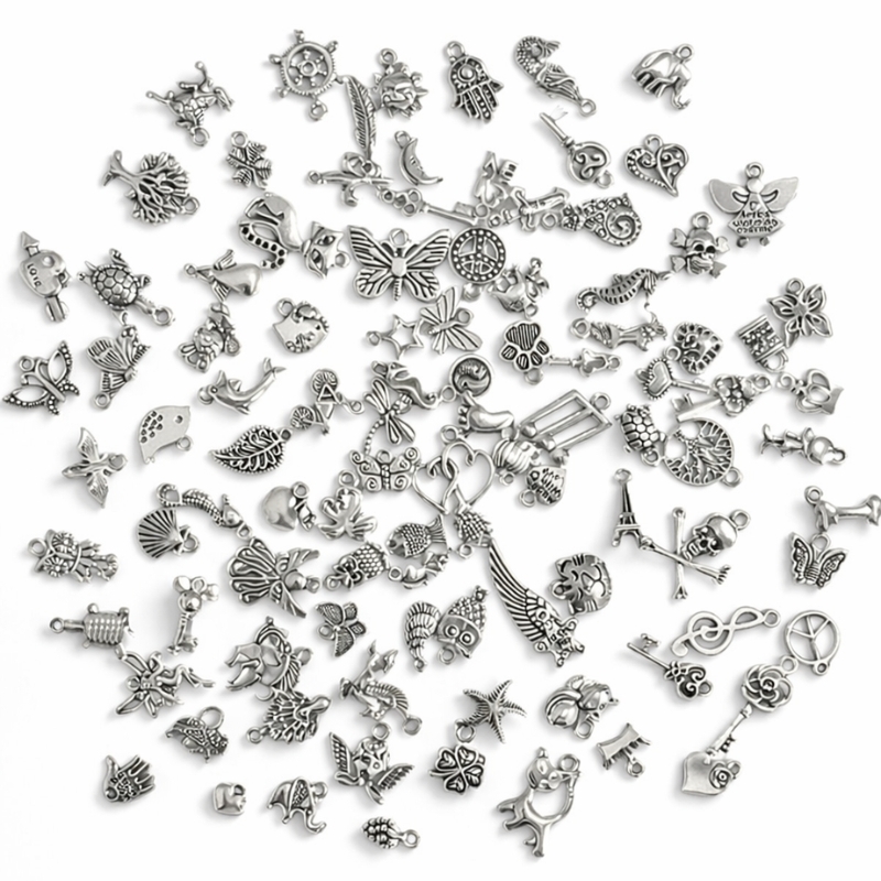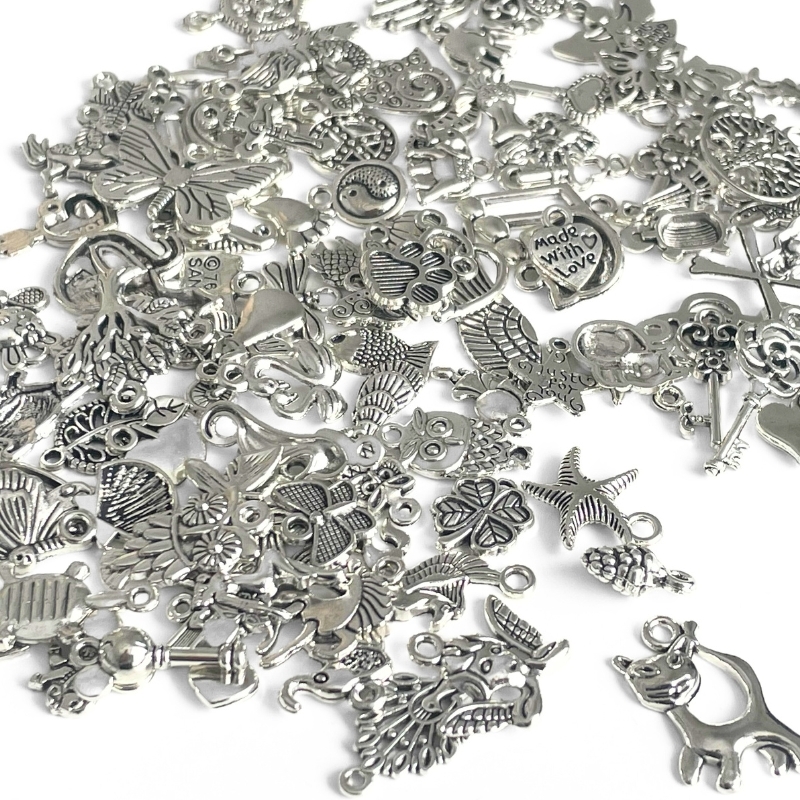 Dette er en blandet pose med omkring 100 små charms og vedhæng i antik sølvfarve. Motiverne er forskellige og kan variere fra pose til pose, men typisk finder du en god blanding af dyr, symboler, hjerter, nøgler, blade, stjerner, figurer og små grafiske former. Nogle er enkle og flade, andre har mere struktur og små detaljer, så der er noget at lege med, uanset om du laver noget meget enkelt eller lidt mere fyldigt.
