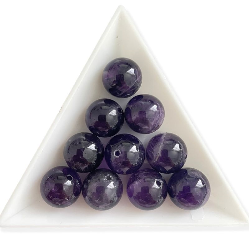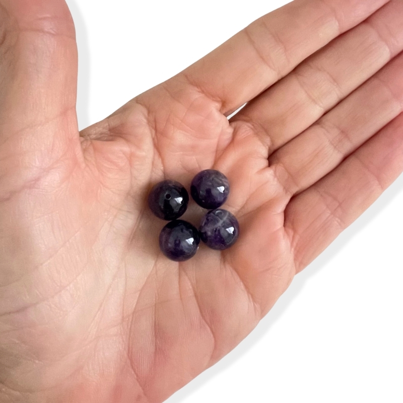 Disse runde ametystperler har en dyb lilla farve, der varierer en smule fra perle til perle. Den glatte overflade og den let gennemsigtige struktur giver dem et roligt og naturligt udtryk.
