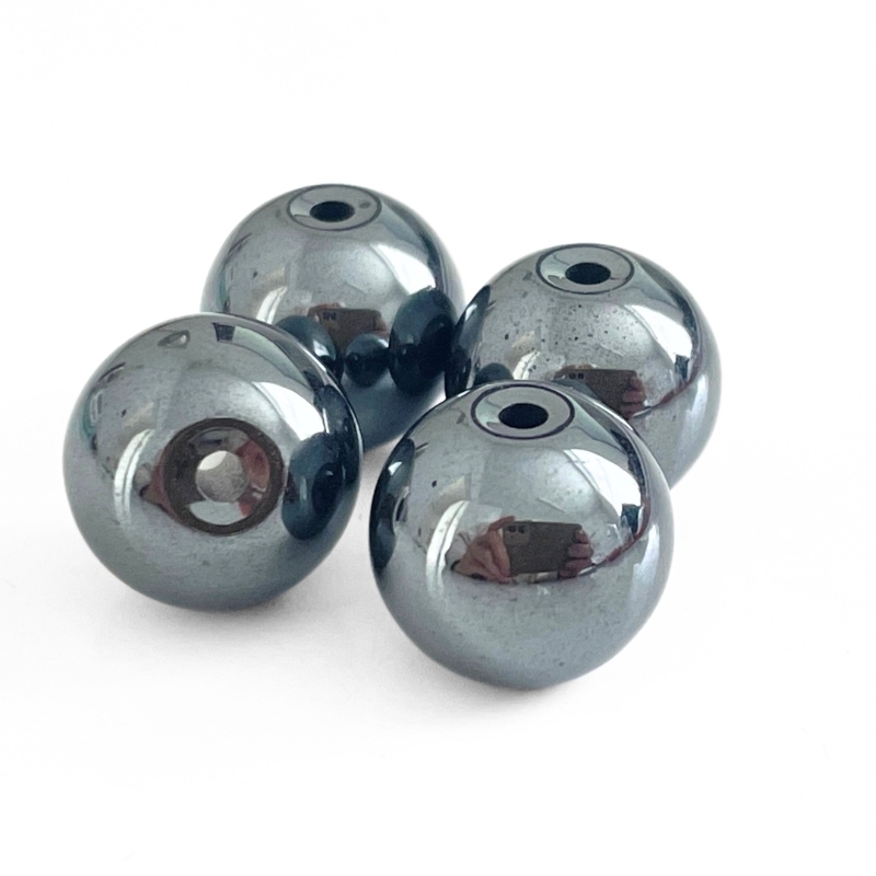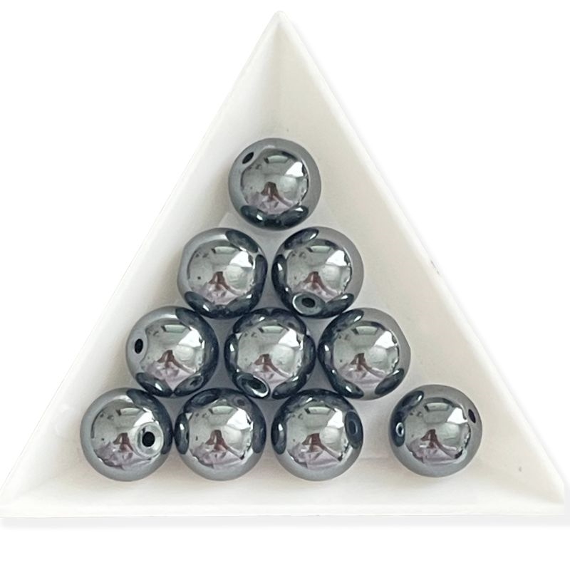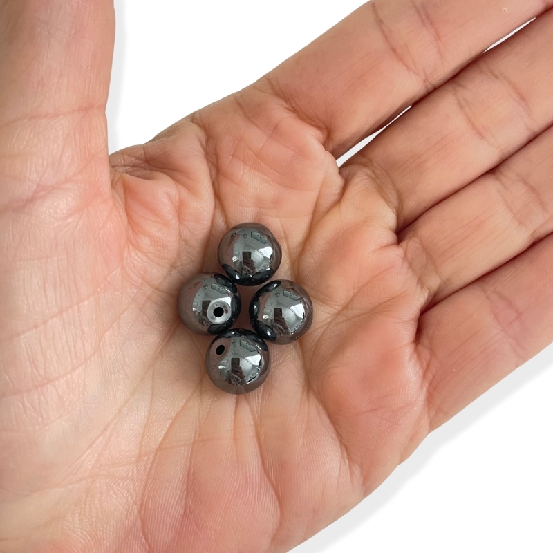 Disse hæmatitperler har en mørk, spejlblank overflade og en tung, kompakt fornemmelse, som er kendetegnende for ægte hæmatit. Farven er dyb grå med metallisk glans, og overfladen er helt glat og ensartet. Perlerne er slebet til en helt rund form og virker både enkle og markante i udtrykket.