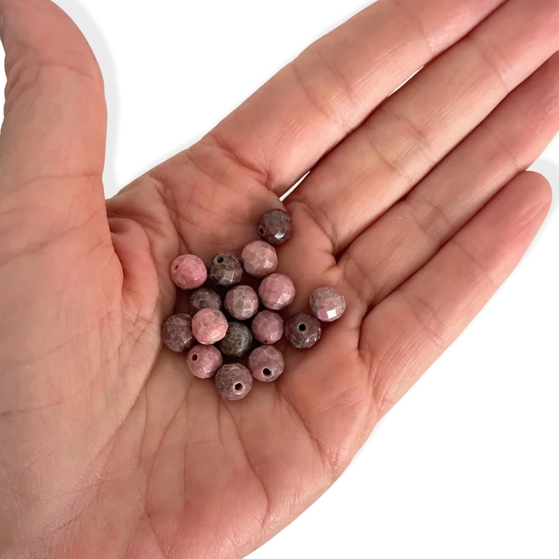 Små facetterede rhodonit perler i nuancer af rosa, støvet pink og mørkere brunlige toner. De fine facetslibninger giver perlerne et let glimt og en levende overflade, som fremhæver stenens naturlige struktur.