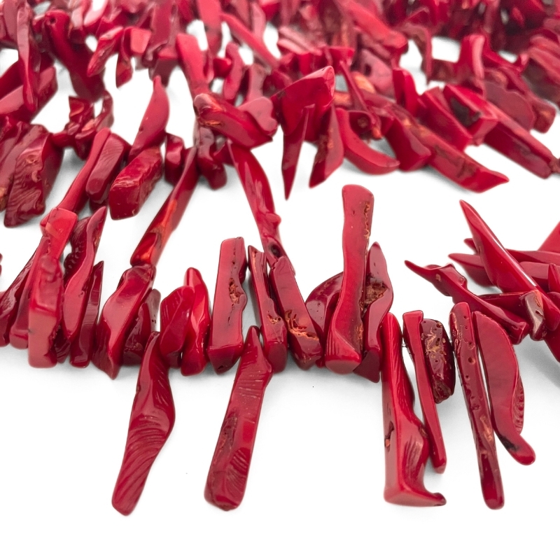 En streng med uregelmæssige koralstave i varme, mørkerøde nuancer. Hver perle har sin egen form og struktur, hvilket giver et levende og organisk udtryk. Overfladen varierer fra glat til let ujævn, og enkelte stykker viser små naturlige fordybninger.