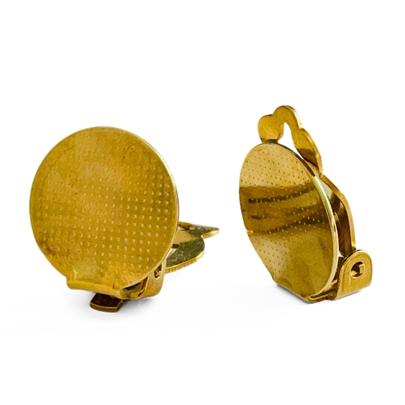De her guldfarvede clips øreringe har en rund plade på ca. 15 mm, som gør det nemt at lime perler, cabochoner eller andre pyntedele på. De er lavet i metal med et klassisk clips-beslag, der sidder godt på øret uden at klemme for hårdt. Et godt valg, hvis du vil lave øreringe til nogen, der ikke har huller i ørerne, eller hvis du selv vil kunne skifte look uden permanente smykker. Pladen har en let ru overflade, så limen hæfter bedre, og du kan let skabe dine egne personlige designs.
