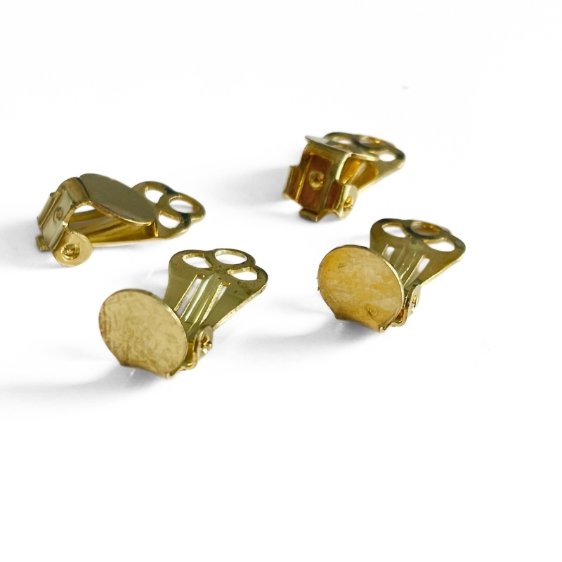 De her guldfarvede øreclips har en rund plade på ca. 10 mm, der er klar til limning af pynt, cabochoner eller små dekorationer. Clipsen sidder behageligt på øret og er nem at tage af og på, uden at klemme for hårdt. Overfladen på pladen er let ru, så limen fæstner godt, og de kan bruges til både lette og lidt tungere øreringe. En enkel og praktisk base, der gør det nemt at designe personlige øreringe – også til dem, der ikke har huller i ørerne.