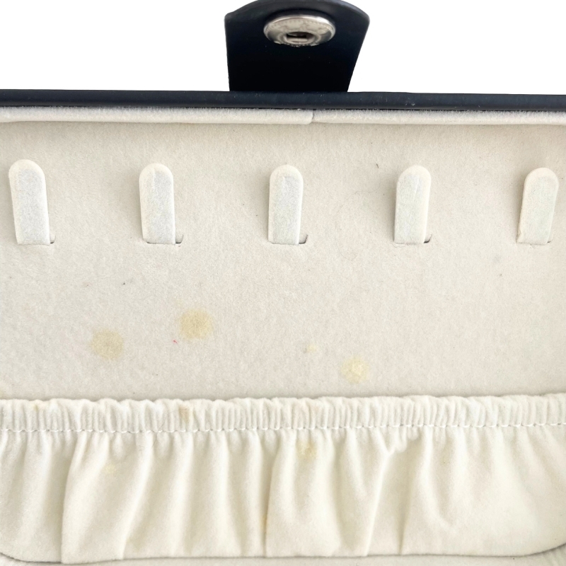 Da dette er 2. sortering, kan der forekomme misfarvninger eller pletter i foret, hvilket også kan ses på billederne. Selve funktionen fejler dog ikke noget, og skrinet er stadig brugbart til opbevaring af smykker.