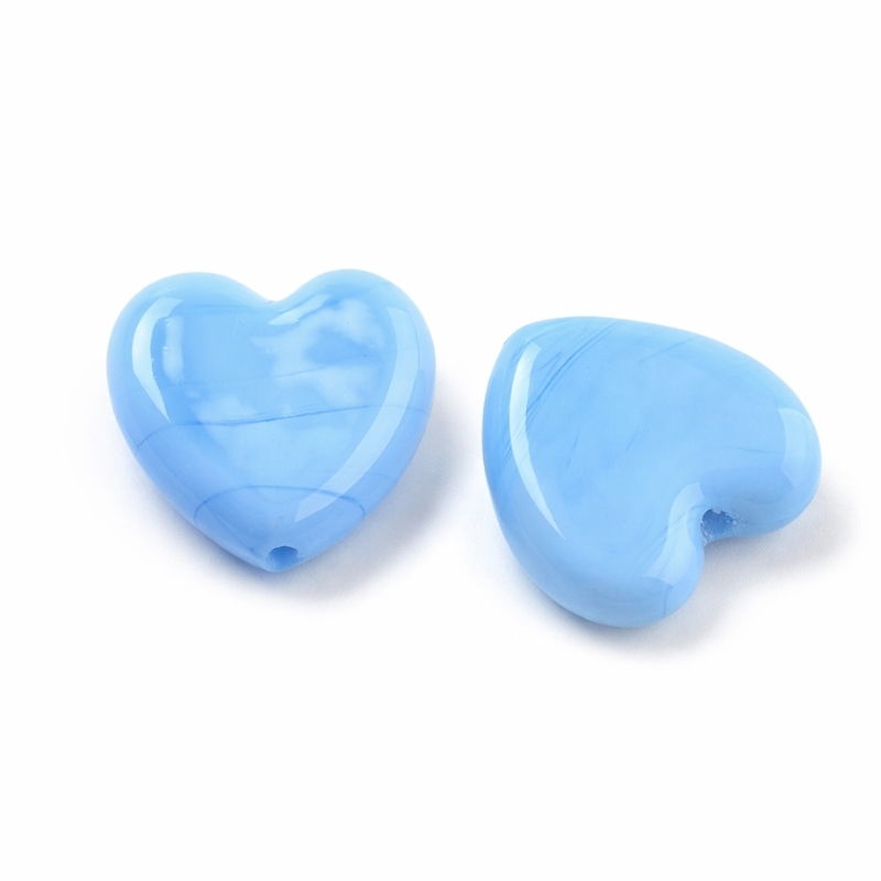 De her hjerteperler er lavet i blåt lampwork-glas og har en blank overflade med lette variationer i farven. Det giver et mere levende udtryk end helt ensfarvede perler. Formen er blød og afrundet, og perlerne føles behagelige at arbejde med, både alene og sammen med andre materialer.