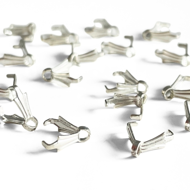 Små forsølvede hæmper med øje, der gør det let at afslutte dine perler og vedhæng. Øjet i toppen passer fint til at sætte i øsken, snor eller kæde, og den åbne bund kan trykkes omkring en perle med hoved- eller ørepind. Det er en praktisk lille del, der både holder styr på smykkedele og giver et rent udtryk. Velegnet til øreringe, vedhæng og charms – især når du vil lave flere på én gang og gerne vil holde udtrykket ensartet.