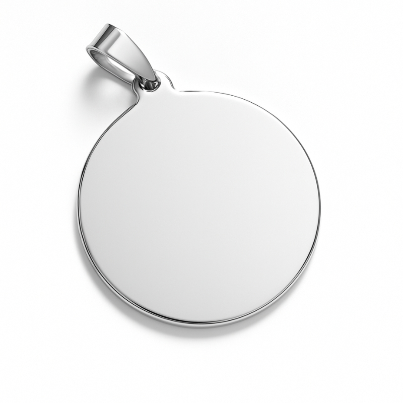 Dette dog tag er rundt og har en glat, blank sølvfarvet overflade, som gør det meget neutralt og nemt at bruge i mange slags projekter. Den faste øsken gør det klar til brug, så du hurtigt kan sætte det på en kæde, snor eller nøglering. Den store flade gør det også oplagt, hvis du vil dekorere pladen selv, fx med små vedhæng, bogstaver, klistermærker eller andre detaljer, der kan tåle at sidde på metal.