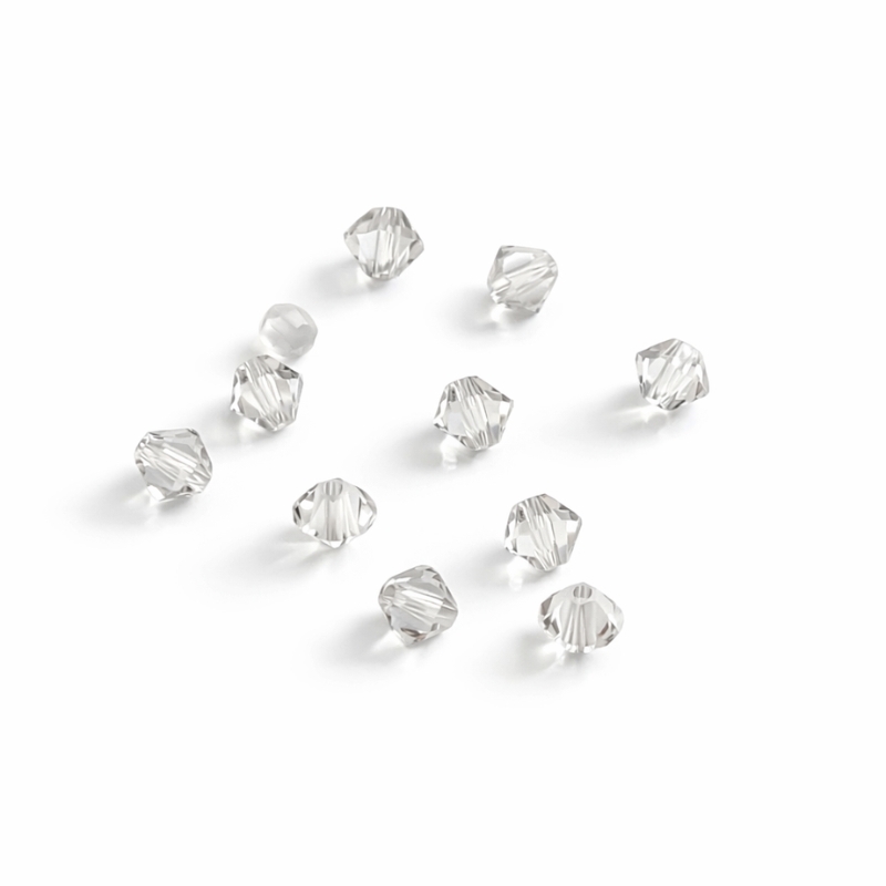 Det her er små facetslebne Swarovski  bicone krystalperler i 4 mm. Formen er den klassiske dobbeltkegle, hvor facetterne mødes på midten og giver et tydeligt og rent lys-spil, selv i den lille størrelse.