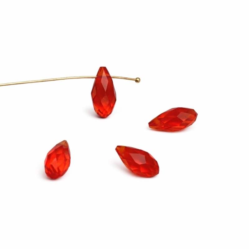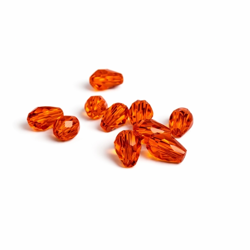 Disse mørk orange glasdråber har en dyb og varm farve, som skiller sig ud uden at være skrigende. Den facetslebne overflade gør, at lyset rammer fra flere vinkler og giver et fint spil i perlen.