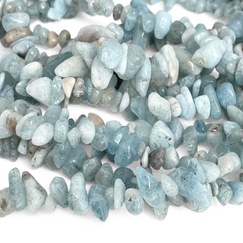 Denne streng består af aquamarin i uens stykker, som varierer i både størrelse og form. Farven ligger i et spektrum fra helt lys blå til mere støvede blågrå toner, hvilket giver en kølig og rolig helhed. De naturlige variationer i stenen gør, at hvert smykke bliver unikt.