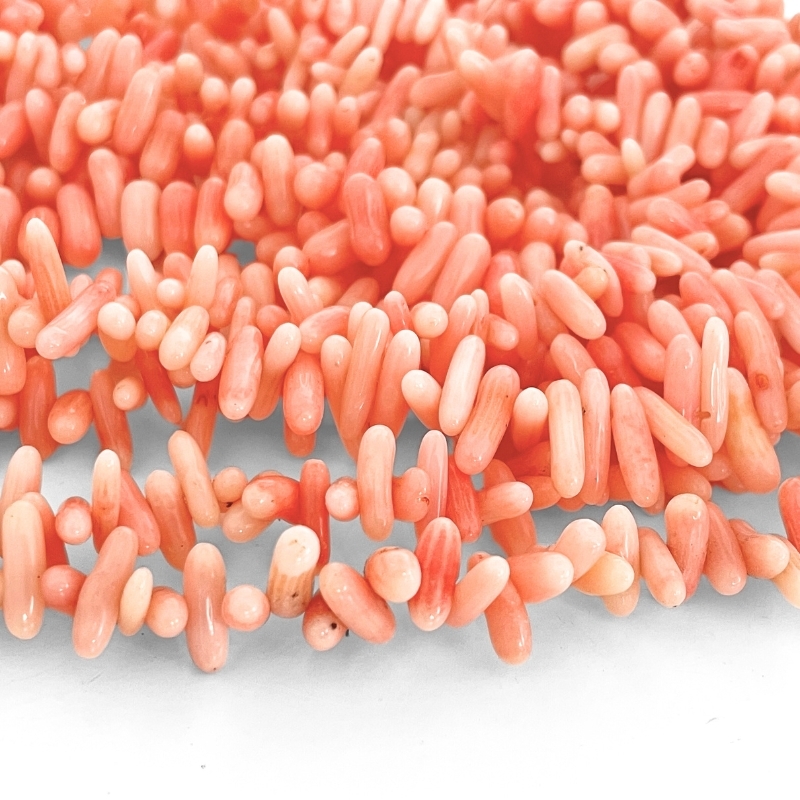 Denne streng er lavet af aflange stykker koral, hvor hver chip varierer en smule i længde og tykkelse. Formen er mere stavlignende end de klassiske små chips, hvilket giver en helt anden dynamik i smykkerne. Farverne spænder fra blød rosa til en mere intens koralrød, og de naturlige variationer giver et levende og varmt udtryk.