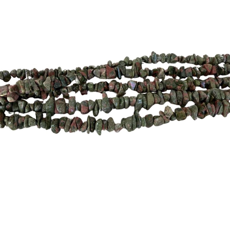 Unakit er en blandingssten af grøn epidot og rosa feldspat, hvilket giver de karakteristiske farver. Denne streng består af uens chips i små størrelser, som tilsammen giver et råt og naturligt udtryk. Farvesammensætningen gør smykkerne levende og unikke, da ingen chips er helt ens.