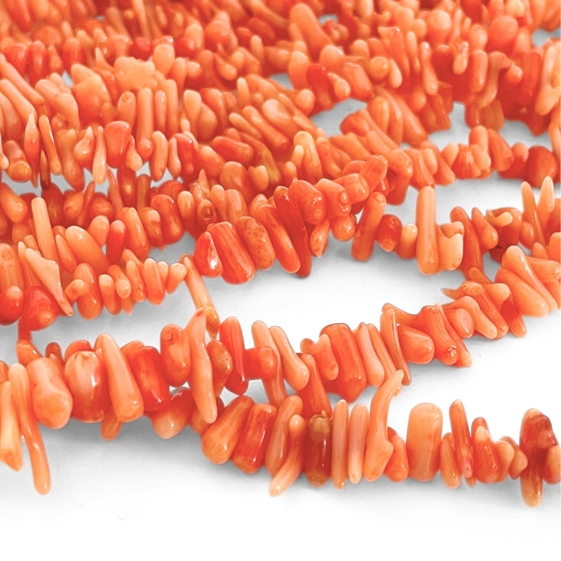 Denne streng består af små stykker koral, der varierer meget i størrelse og form. Farven bevæger sig mellem lys orange og dybere rødorange, hvilket giver et livligt og varmt farvespil. De uens stykker gør, at perlerne får et naturligt og organisk udtryk, som er helt særligt for koral.
