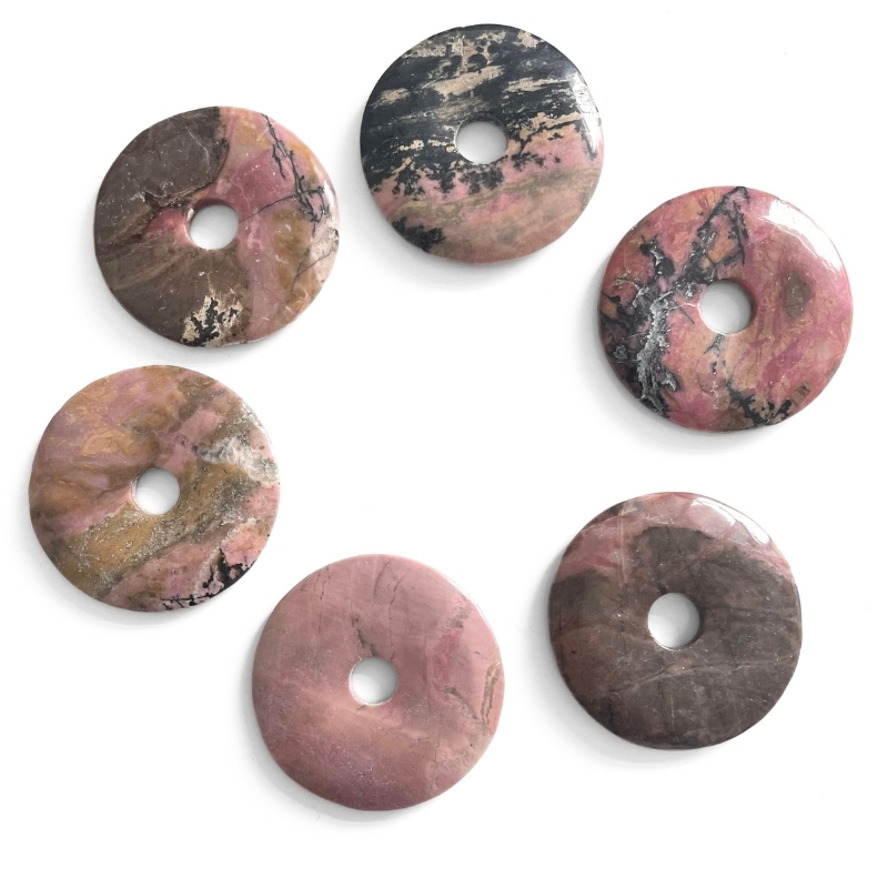 Donut i ægte rhodonit – en natursten med smukke nuancer i rosa, brun, grå og sort. Nogle sten har mere pink og rødt, mens andre trækker mod mørkere toner med tydelige årer af sort mangan. Farvespillet gør hver enkelt donut levende og individuel.