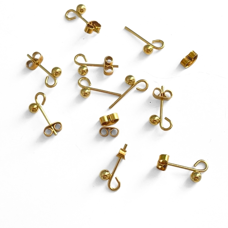 Ørestikkerne er lavet i forgyldt messing og har en lille kugle på 3 mm foran. Under kuglen sidder et fast øje, som gør det nemt at tilføje ekstra dele og bygge videre til færdige øreringe.