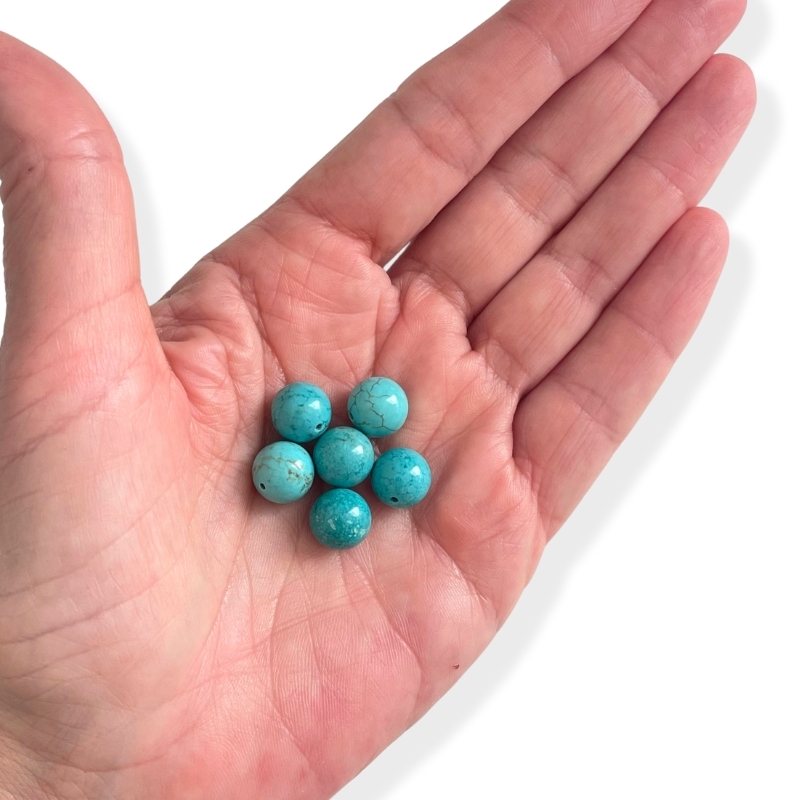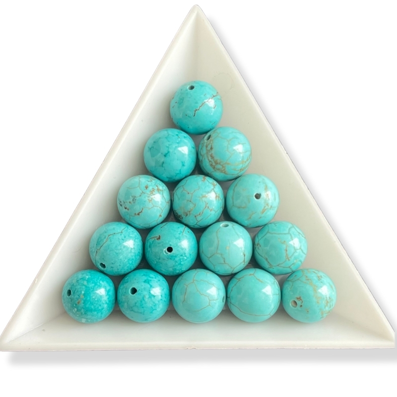 Perlerne her er lavet af farvet magnesit, som med sin turkise farve og de naturlige åremønstre minder meget om ægte turkis. De har en glat overflade og er nemme at arbejde med i mange slags smykkeprojekter – både når det skal være enkelt og når der skal bygges op med flere lag eller detaljer.