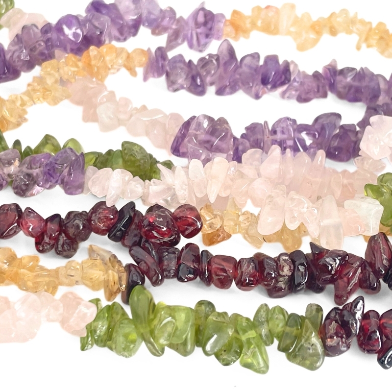 Her får du en streng med splitterperler i et klart og genkendeligt miks af natursten. I blandingen kan du finde lilla ametyst, lyserød rosenkvarts, gul citrin, rød granat og grøn peridot. Kombinationen giver en fin balance mellem lyse og mørke nuancer, så du får mange muligheder for at skabe smykker med spil og variation. Splitterperlerne er uens i formen, hvilket gør smykkerne mere levende og naturlige at se på. Strengen er 84 cm lang, hvilket giver god plads til at lave et helt smykke direkte eller til at dele op i flere små projekter. De enkelte sten forbindes ofte med bestemte energier – ametyst bliver set som en beroligende sten, citrin som en sten for glæde, granat som symbol på styrke og rosenkvarts som en klassiker for kærlighed. Peridot har historisk været forbundet med velstand og beskyttelse. Uanset om man tror på disse fortællinger eller bare holder af de flotte farver, er det en streng med mange anvendelsesmuligheder.