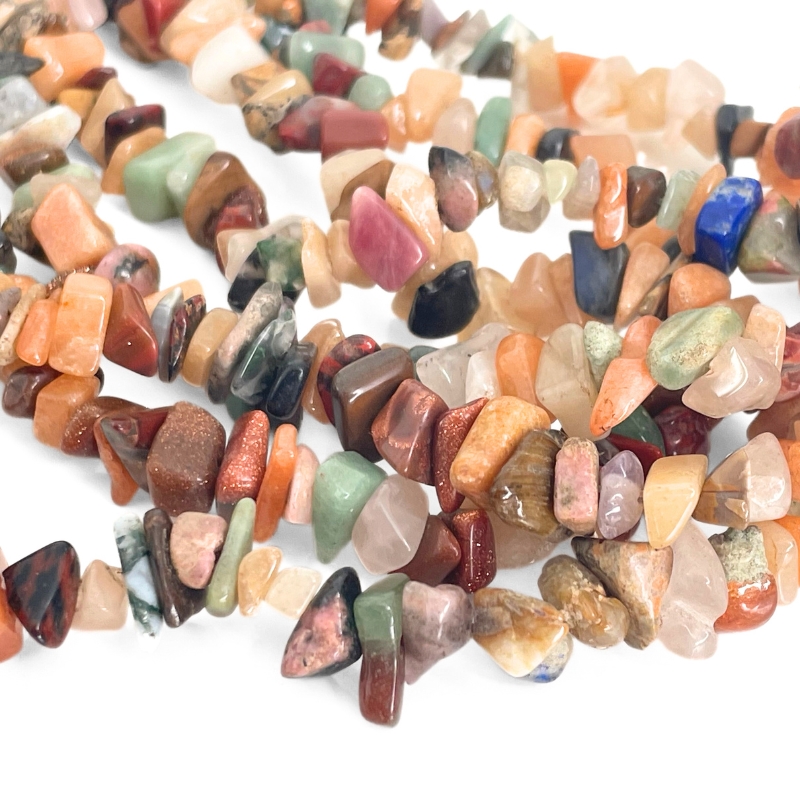 Denne lange streng består af små splitterperler i mange forskellige natursten. Stenene er blandet i farver og former, så ingen streng er helt ens. Du finder blandt andet rosenkvarts i lyserød, grøn aventurin, blå sodalit og forskellige typer jaspis. Derudover kan der være andre halvædelsten i blandingen, som giver hver streng sit helt eget udtryk. Splitterperlerne er uens i størrelsen, hvilket giver et levende og råt udtryk. Det gør dem særligt gode til mere afslappede designs eller hvis du ønsker et naturligt og lidt vildt look i dine smykker.