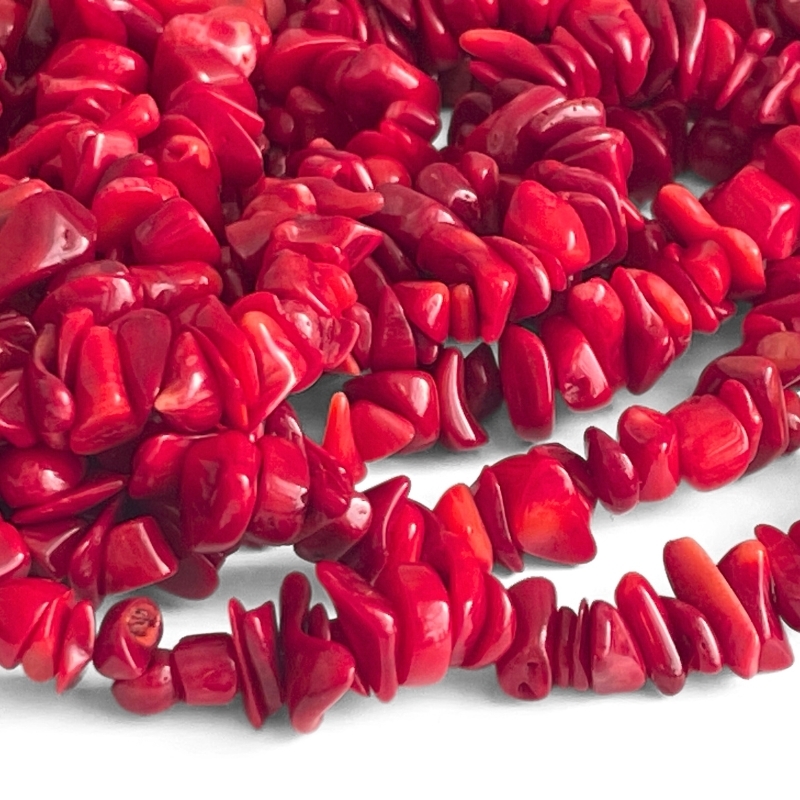 Denne streng er fyldt med små stykker koral i uens former, som giver liv og struktur i smykker. Den stærke røde farve er fremhævet ved farvning, så udtrykket bliver mere ensartet og tydeligt. Chipsene ligger tæt og giver en flot fylde i armbånd og kæder, men kan også bruges enkeltvis i øreringe eller som små detaljer i et mix med andre sten. Med hul på ca. 0,8 mm passer de til tynd wire, smykketråd eller elastik.