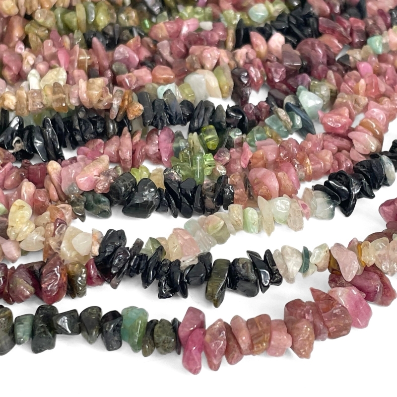 Strengen er sammensat af mange små stykker turmalin, der spænder i farve fra bløde rosa og grønne nuancer til mørke, næsten sorte chips. Det giver et naturligt farvemiks med masser af liv. De uens former ligger tæt, så smykkerne får struktur uden at virke tunge. Længden på 90 cm gør den fleksibel: brug den som en enkel kæde, del den i flere mindre projekter, eller pluk enkelte chips som små farveprikker i øreringe. Hullet på ca. 0,6 mm passer til tynd wire, elastik eller almindelig smykketråd.