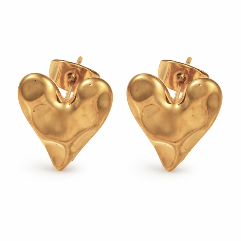 Et par guldfarvede hjerte ørestikker i rustfrit stål med en let banket overflade. Formen er blød og rund, og overfladen har små ujævnheder, som giver lidt spil i metallet uden at det bliver for blankt og glat.