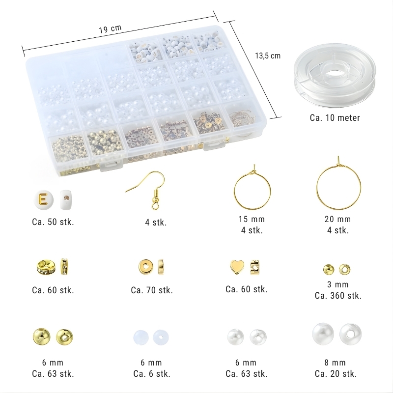 Her får du et komplet sæt med alt, hvad du skal bruge for at komme i gang med at lave dine egne smykker. Der er både hvide perler i plast og akryl med perlemorsskær og mange små guldfarvede dele, som giver mulighed for at skabe kontraster og detaljer. Du får også bogstavperler, så du kan lave armbånd med navne eller ord – både til dig selv og som gaveidé.