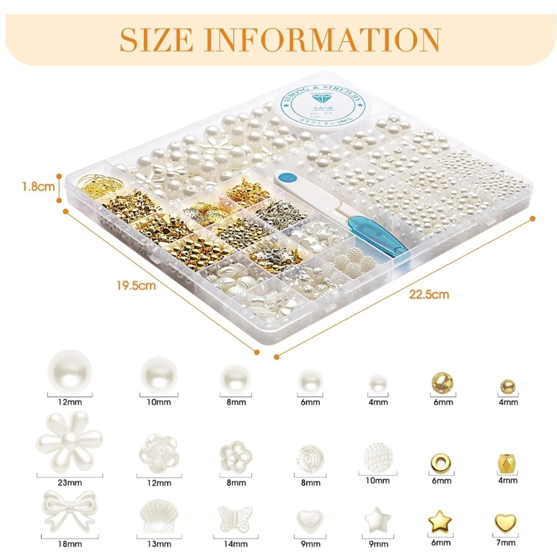 Dette sæt er til dig, der gerne vil lave hjemmelavede smykker uden alt for meget bøvl. Der er både klassiske runde perler og formede perler som blomster, stjerner, sløjfer og hjerter – plus lidt metaldele og vedhæng, så du kan blande materialer og lave noget lidt mere spændende end bare perlesnor. De hvide perler har en glat overflade og fin glans, og selvom nogle af metaldelene kan miste lidt farve med tiden, gør det ikke så meget, hvis du bruger dem som pynt i kanten eller som små detaljer.