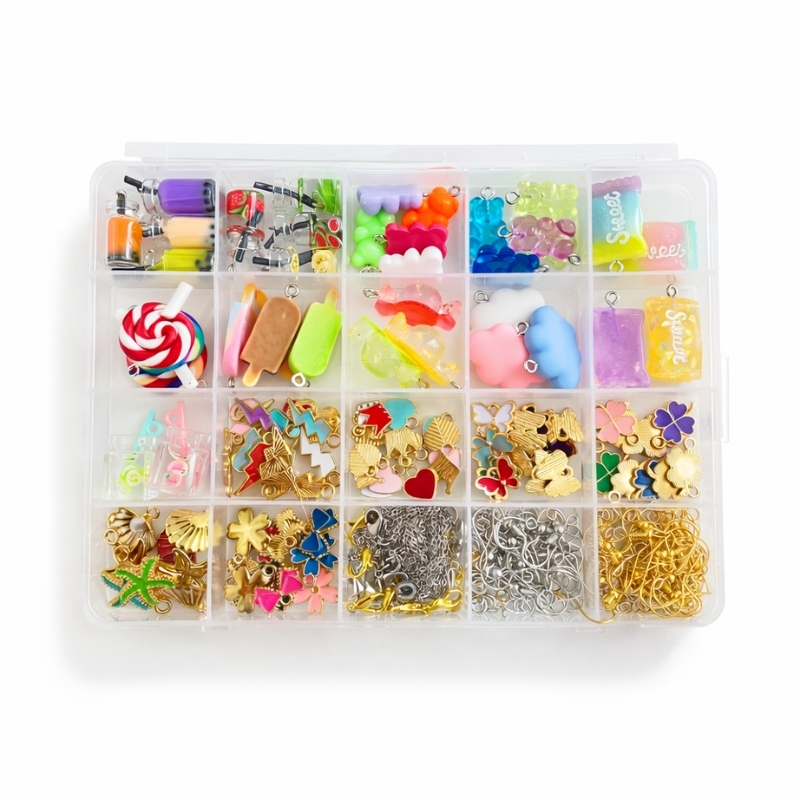 Du får en blanding af resin charms formet som blandt andet is, vingummibamser, bubble tea, bolsjer, sommerfugle, firkløver og små hjerter. Farverne spænder fra klare pangfarver til mere rolige pasteller. Der følger også ørekroge i både guld- og sølvfarve, kæder, karabinlåse og små øskner, så du kan samle dine smykker med det samme.