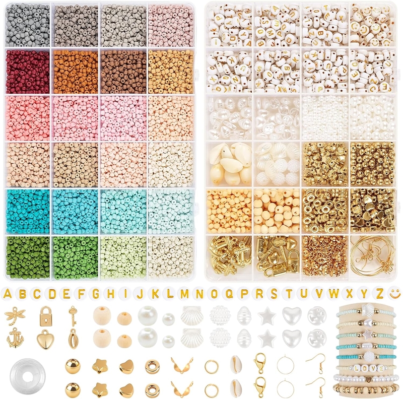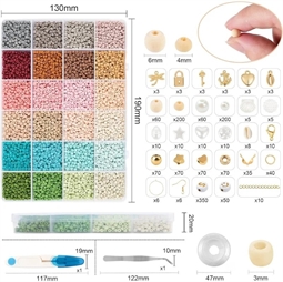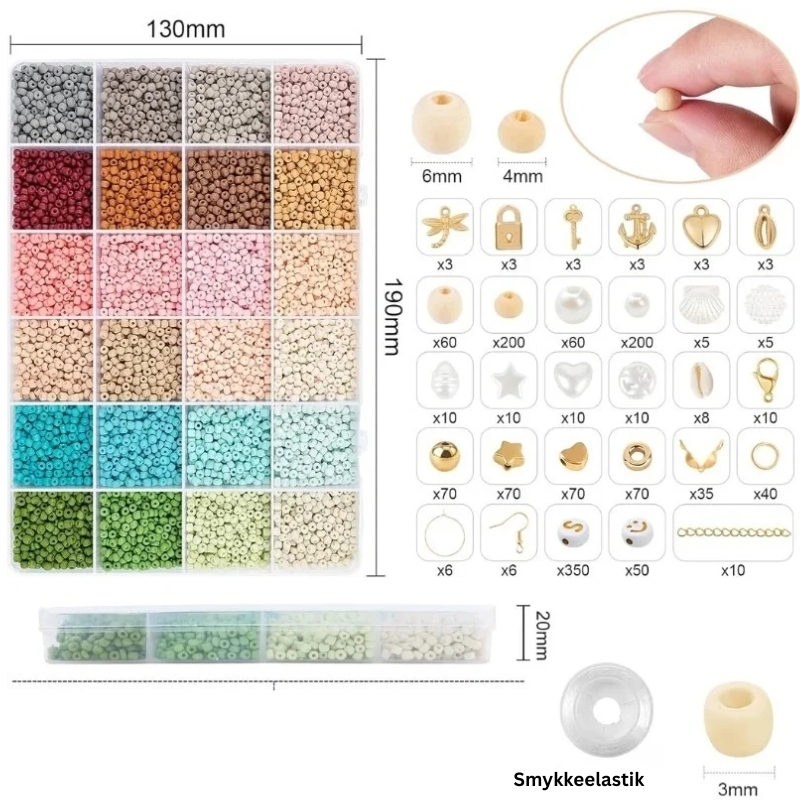 Et komplet gør-det-selv sæt fyldt med alsidige perler og tilbehør til smykkefremstilling. Seed beads i 24 smukke, matte farver kombineres med et udvalg af figurer og tekstperler – inkl. bogstaver, smileys og naturinspirerede designs som muslinger og træperler. Med klar elastiksnor og pincet er det nemt at komme i gang. To rummelige plastikbokse holder styr på hele samlingen, og gør sættet perfekt både til nybegyndere og kreative sjæle, der elsker at designe deres egne smykker fra bunden.