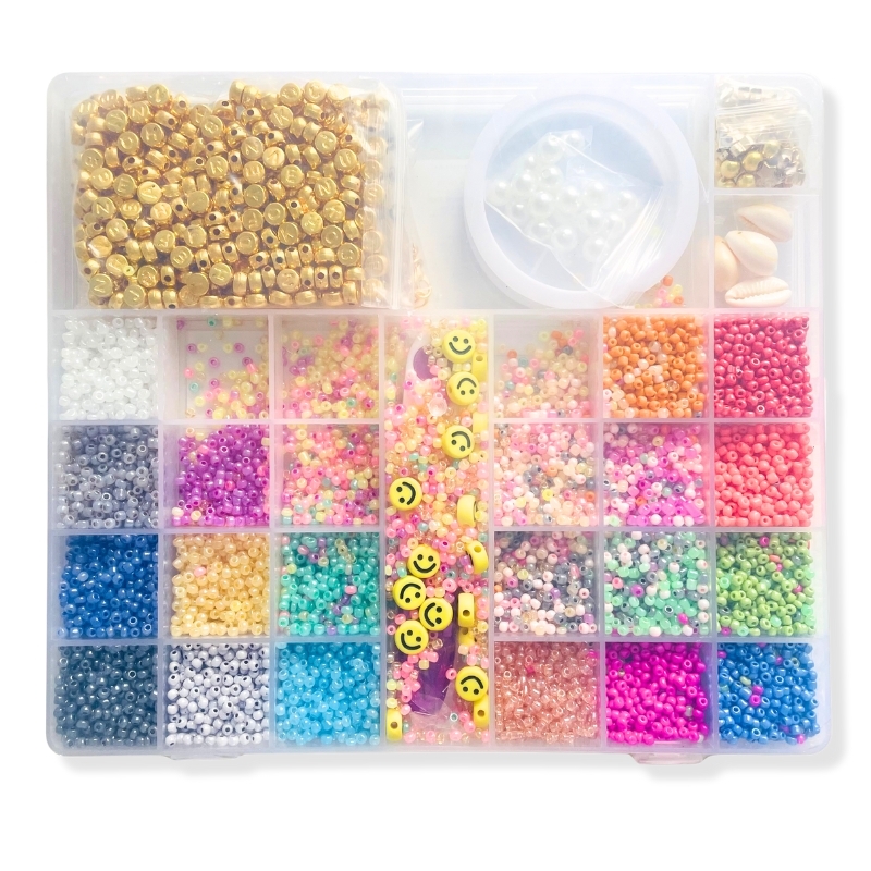 Her får du en stor æske fuld af perler og dele – men alt ligger blandet sammen i rummene efter transport. Indholdet er det samme som normalt: farverige perler i både plastik, glas og akryl, bogstavklodser, smileys, guldcharms og forskellige smykkedele. Der er også elastiktråd, en lille saks og pincet med i pakken, så du kan komme i gang med det samme.