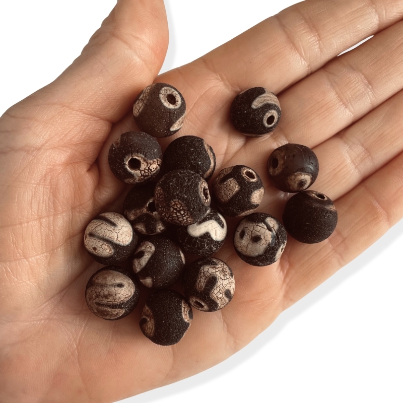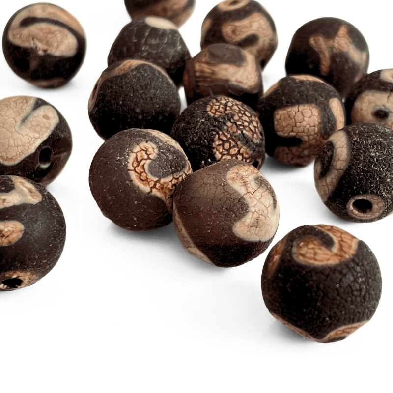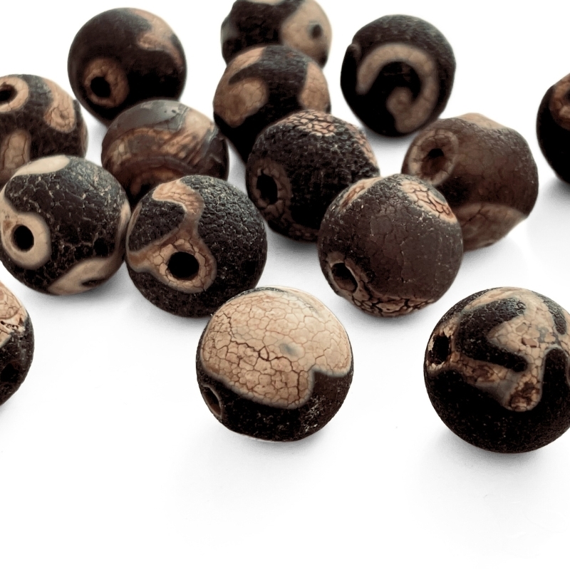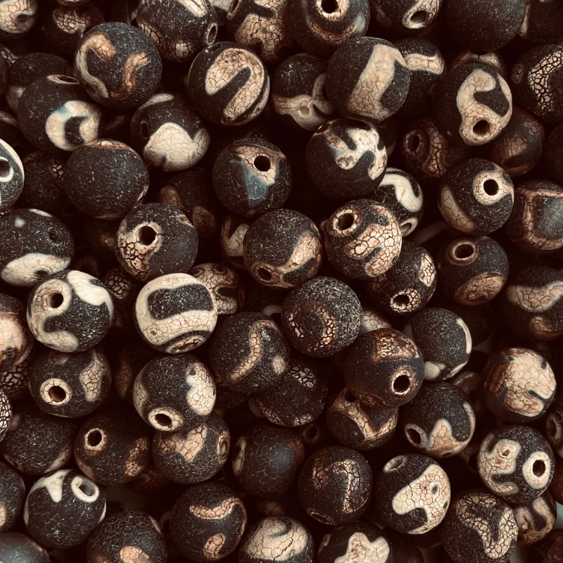Disse perler er fremstillet i en Dzi-inspireret stil, hvor de mørke nuancer kombineres med lysere mønstre, der minder om de traditionelle tibetanske symboler. Overfladen er mat og lidt ru, hvilket giver et naturligt og råt udtryk. Hver perle har sit eget mønster, så ingen pose er helt ens.
