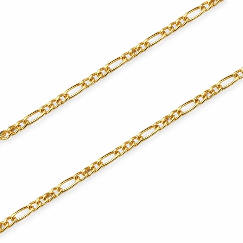 Figaro-kæden her er lavet i forgyldt sterling sølv og har det karakteristiske mønster med ét langt led efterfulgt af tre korte. Kæden er fin og smal, med en bredde på ca. 1,4 mm, og tråden, den er lavet af, er 0,35 mm tyk. De store led måler omkring 3 mm og kan formes let med en rundtang, hvis du f.eks. har brug for at gøre dem mere runde i enderne, når du skal sætte en øsken eller en lås på. Sælges pr. cm, med minimumskøb på 15 cm, så du selv kan vælge, hvor lang kæden skal være – til armbånd, halskæder eller noget helt tredje. Den er velegnet til fine og lette smykkedesigns, hvor kæden gerne må have lidt spil i overfladen, men stadig være enkel og elegant.