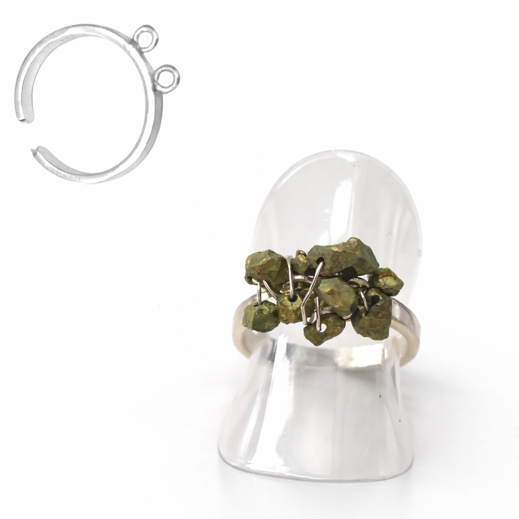 Sølvtråden fastgøres i det ene øje. Sæt en perle på og vikle sølvtråden rundt om ringen. Sæt en ny perle på og fortsæt til du er tilfreds med designet.