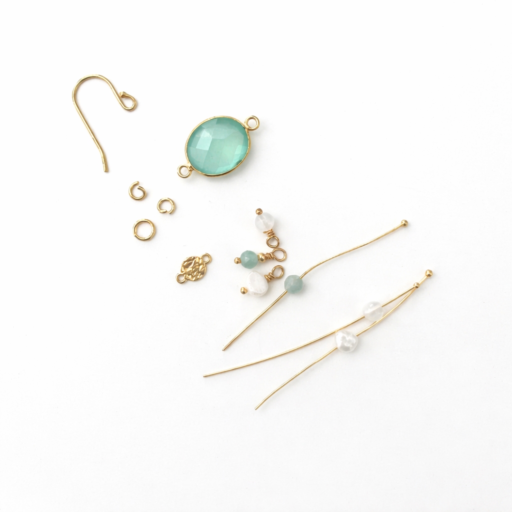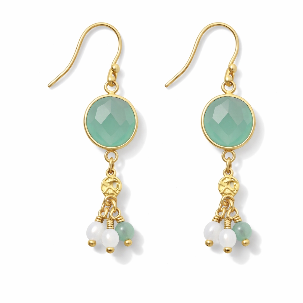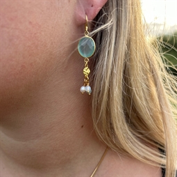 Flot ørering med vedhæng i Aqua chalcedon, mønt og små perler