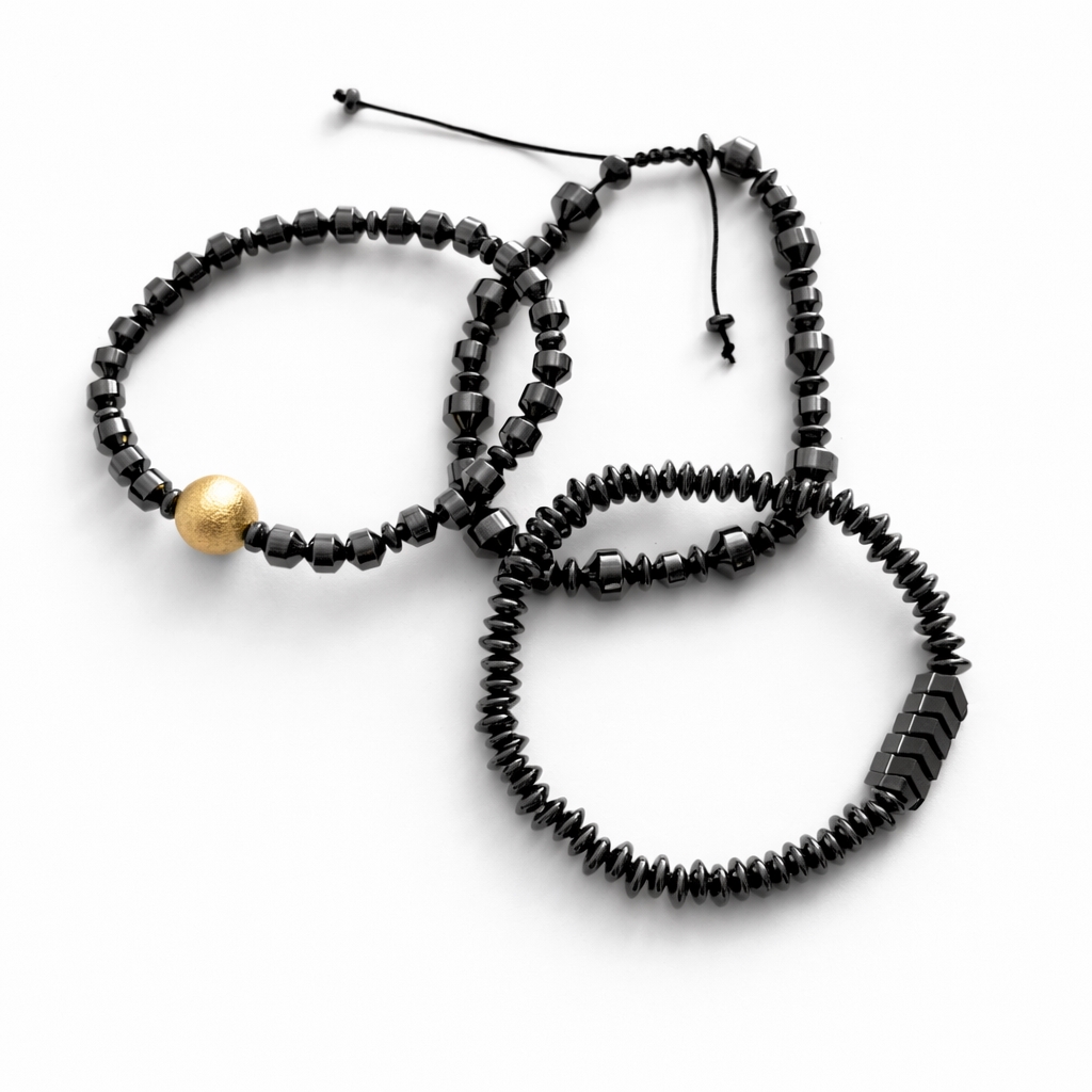 Armbåndene er lavet på knyttesnor og elastik. Vælg dine perler og sæt perlerne på, som du kan lide.