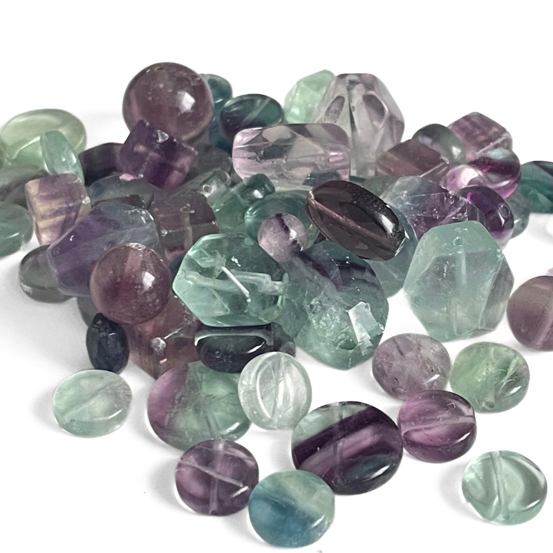 Et flot og levende mix af fluoritperler i de klassiske farver fra stenens naturlige spektrum – fra grøn og klar over blålig til dyb lilla. Hver perle har sit eget farvespil og gennemsigtighed, som gør sammensætningen varieret og harmonisk på samme tid. Stenen er kendt for sine lette nuancer og rolige udtryk, som gør den velegnet til smykker, der skal have et afdæmpet og organisk præg.