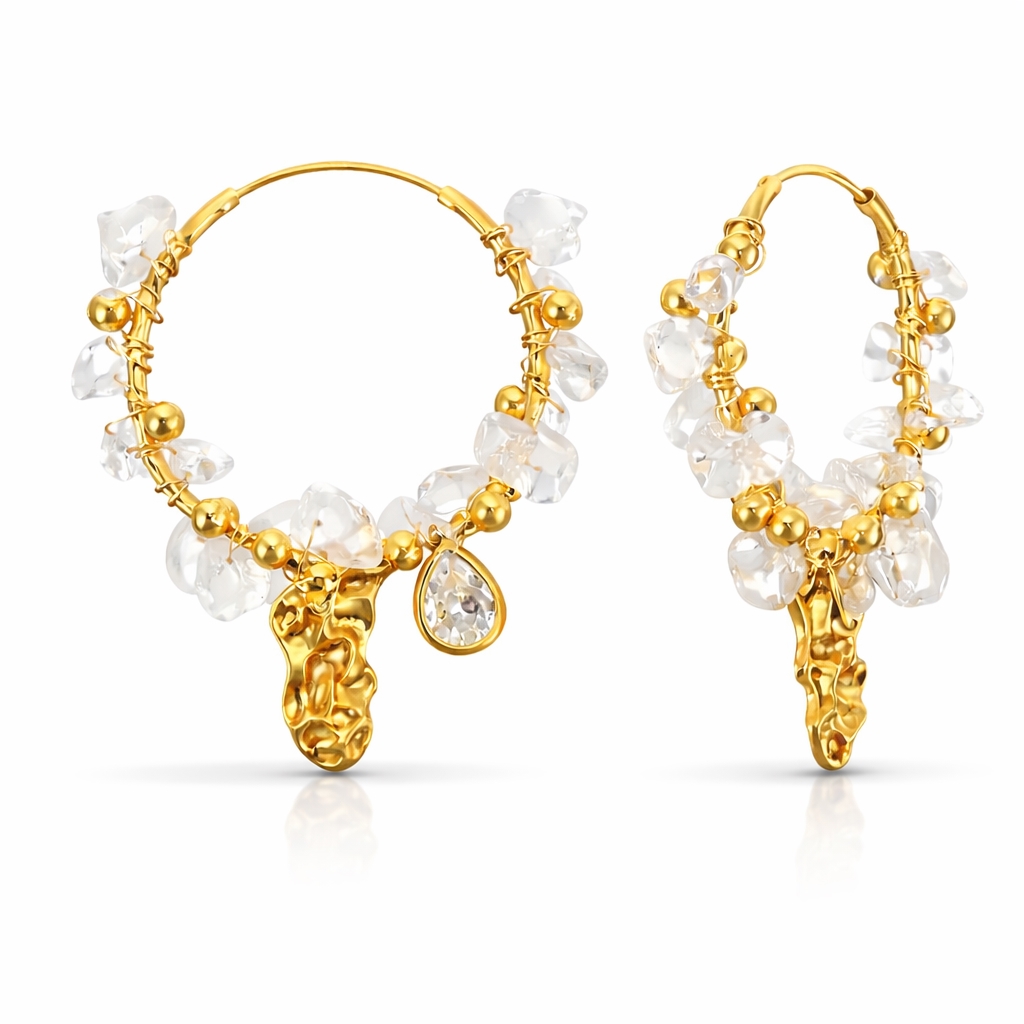Forgyldte creoler med bjergkrystal splitter, 3 mm fg perler og 3 forskellige  fg vedhæng.
