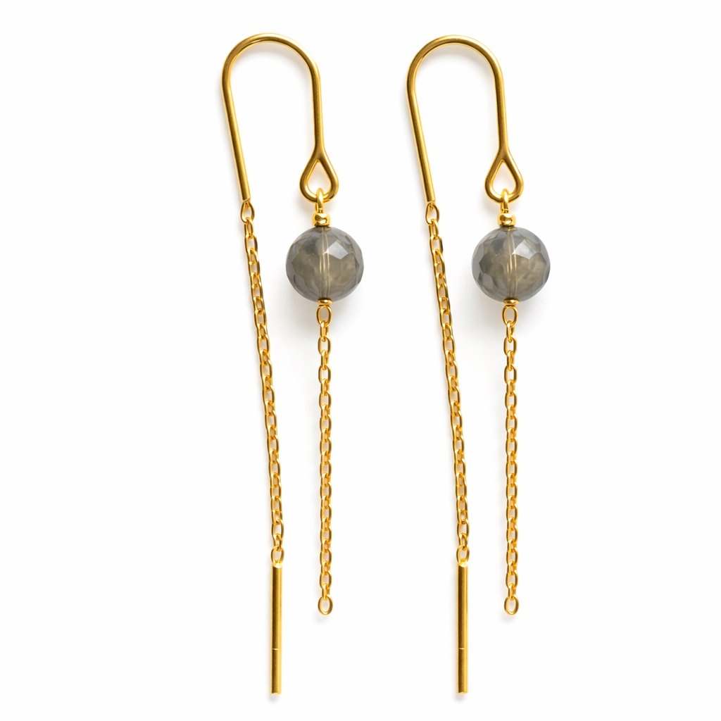 Forgyldte øreringe med facet røgkvarts perler og kæde.