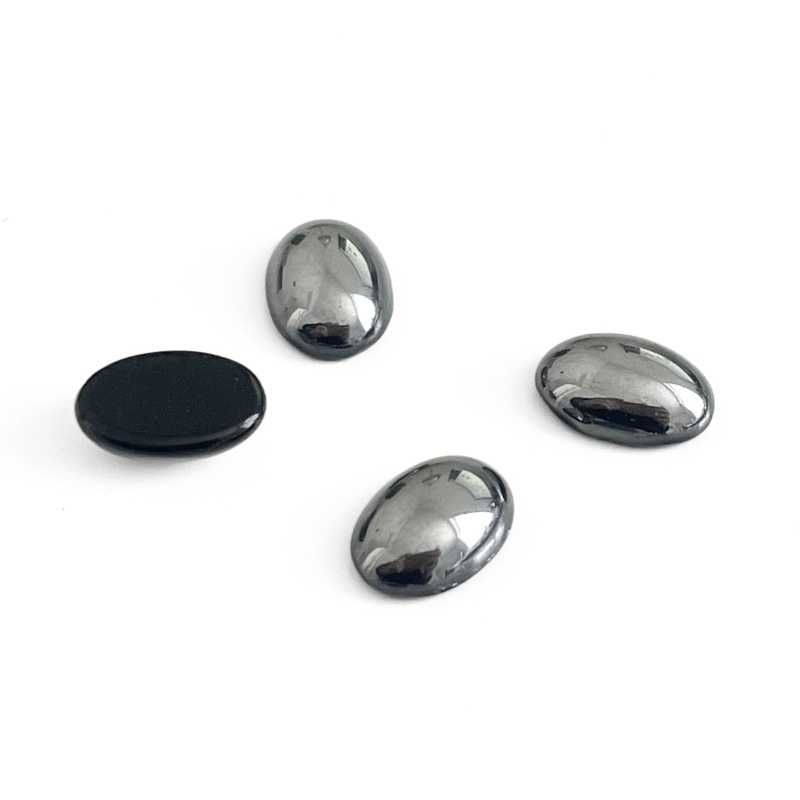 Hæmatit er en tung og tæt sten med en helt glat, metallisk overflade, der næsten føles kølig at røre ved. Den mørke sølvgrå farve giver et roligt, neutralt udtryk, som passer ind i både klassiske og moderne smykker. Disse cabochoner er slebet flade på bagsiden, så de nemt kan limes i en fatning eller på metalplader.