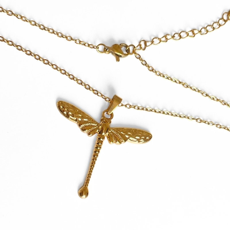 Halskæden består af en fin guldsmed i gylden farve, der hænger i en tynd kæde med lille karabinlås. Den er lavet i rustfrit stål og belagt med et tyndt lag 18K guld, der er lagt på med ionplatering (IP), hvilket giver en mere slidstærk overflade. Guldsmeden har mange fine detaljer i vinger og krop, og vedhænget sidder løst på kæden, så det kan udskiftes hvis man vil. Kæden måler ca. 45–46 cm og har et lille forlængerkæde på 5 cm. så længden kan justeres.